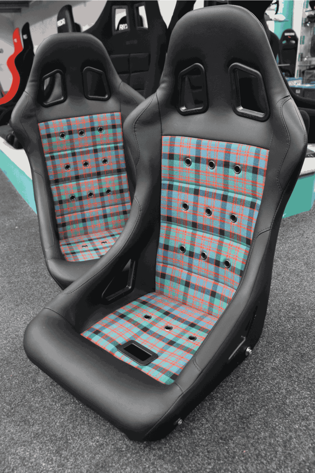 Every so often, something genuinely special passes through our showroom, and this pair of Cobra Monaco 40th Edition bucket seats was exactly that. Made specifically for one of our customers, these seats were finished with a completely bespoke tartan fabric in a striking red, green, blue, and black colour scheme. The tartan wasn’t chosen from a standard Cobra catalogue either; it was personally sourced and supplied by the customer, making this a one-of-one design tailored to their taste.