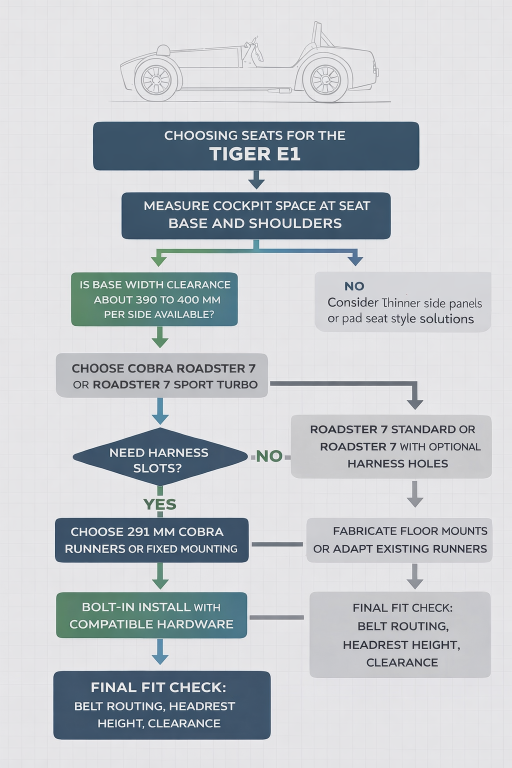 That’s the magic number for the Tiger E1: if the seat is much wider than 400 mm, you are usually heading towards panel trimming, chassis-side fabrication, or simply sending the seat back.