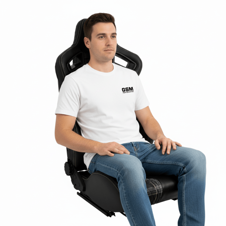 Sport seat ‘GT’ – Black Synthetic leather + Fabric in Yellow checkered pattern + Yellow stitching – Dual-side reclinable back-rest – incl. slides