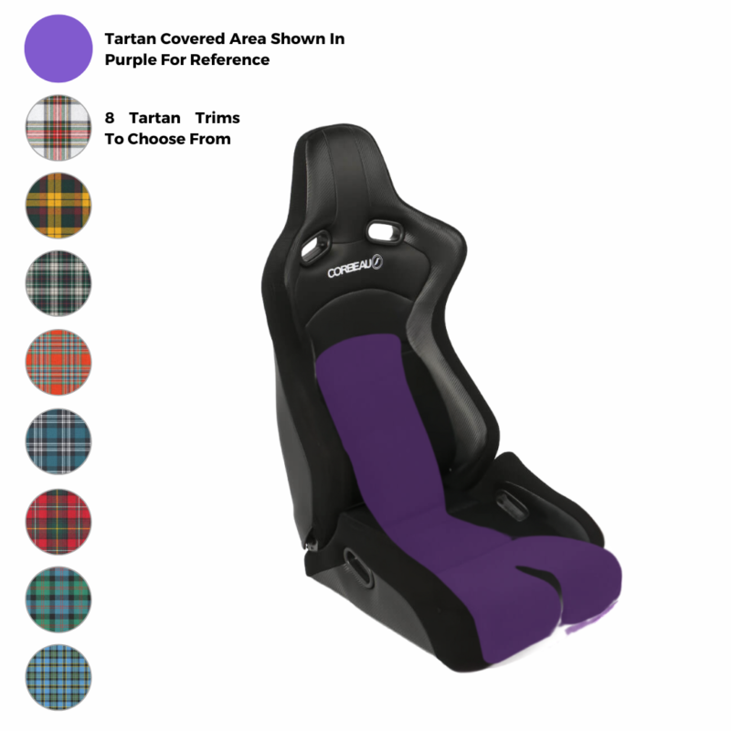 As standard, the RRB Tartan Edition reclining sport seat comes covered in premium black Vinyl and velour fabric trim with black stitching, accompanied by the Corbeau logo embroidered on the front and rear. This seat as standard comes with tartan-covered centre panels in a choice of 8 different patterns.
