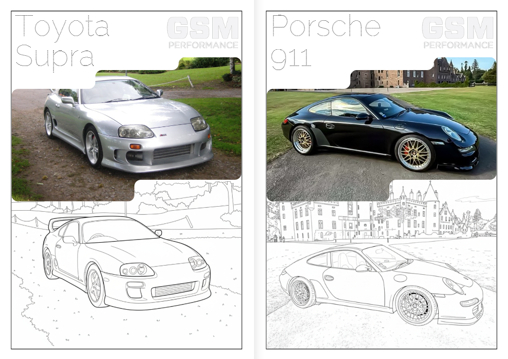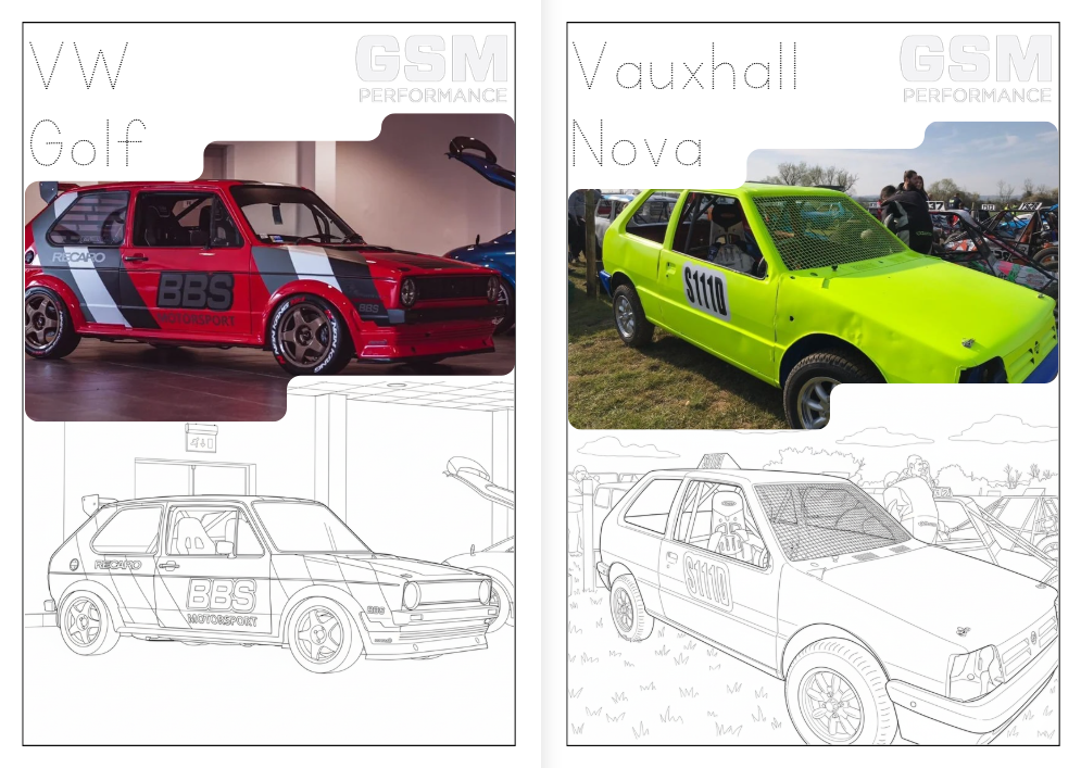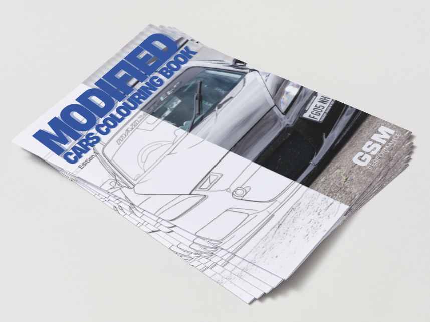 This first edition GSM Performance Colouring Book celebrates real customer cars from across the UK. Every image inside has been hand-created from genuine photographs taken in our showroom or submitted by our customers, featuring builds that we’ve helped equip with seats, harnesses, and safety gear.