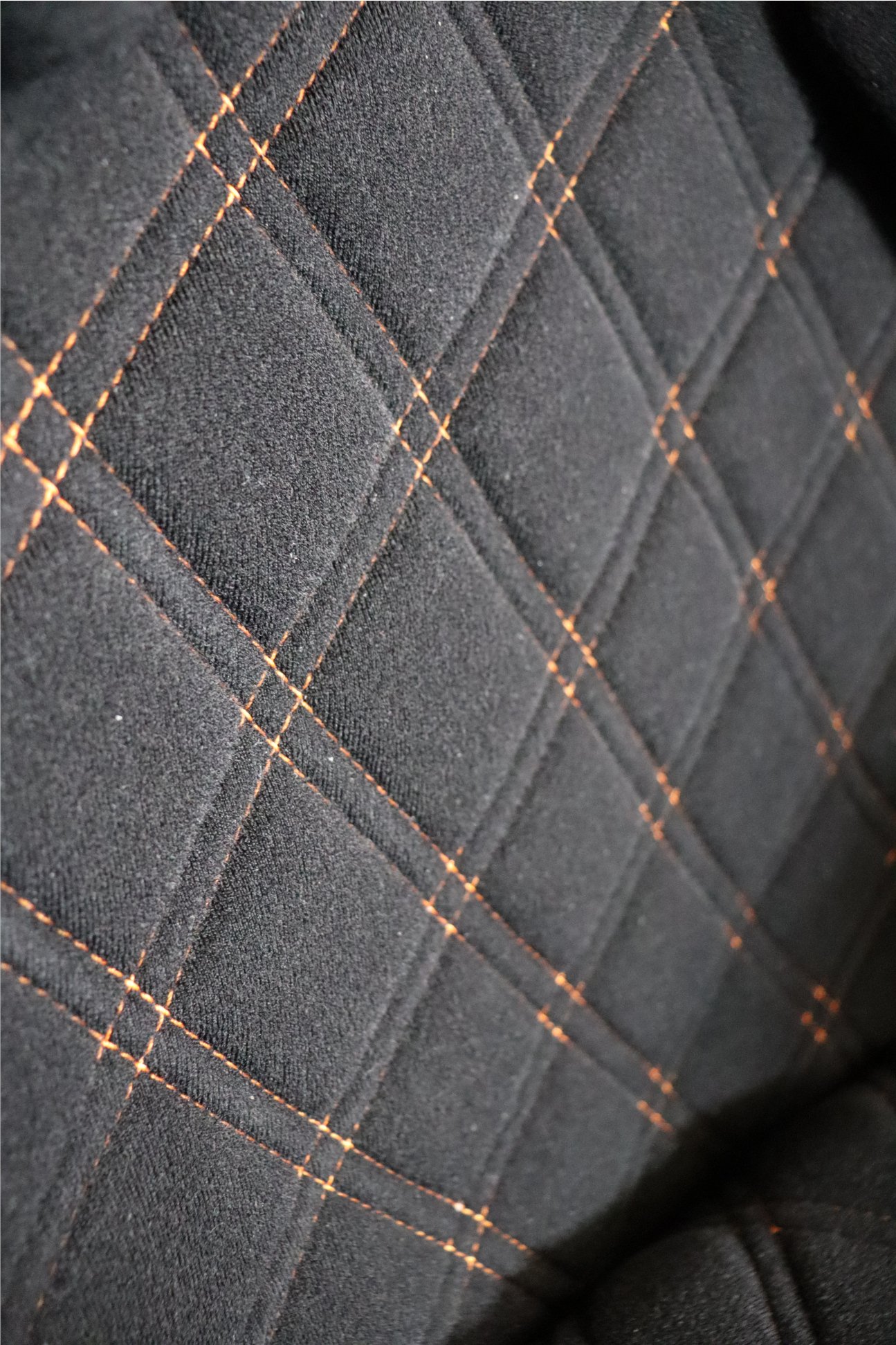 Standard Trim: Black Velour Fabric. Black Shell. Orange Stitch Abarth Embroidery. Orange Diamond Stitching.