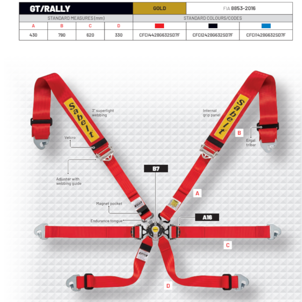 Sabelt 6-Point Gold Endurance FIA Saloon Harness with 3″ superlight webbing. This harness features a steel A16 lap strap tongue with integrated adjuster for 2″ width webbing. Adjuster with webbing guide and B7 buckle developed for endurance applications.