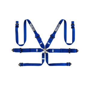 Sparco Club Racer 4 point harness. High quality 4 point clubman race or rally harness, with 3″ / 2″ (75mm / 50mm) shoulder straps and 2″ / 50mm lap straps, all fitted with clip-in style end attachments, suitable for use with eye bolts. These harnesses are equipped with steel adjusters and a lightweight quick release rotary buckle. The shoulder straps can be wrapped around a harness bar as desired. Supplied with eye bolts and suitable for use with a HANS/FHR Device, although a HANS/FHR specific harness is highly recommended.